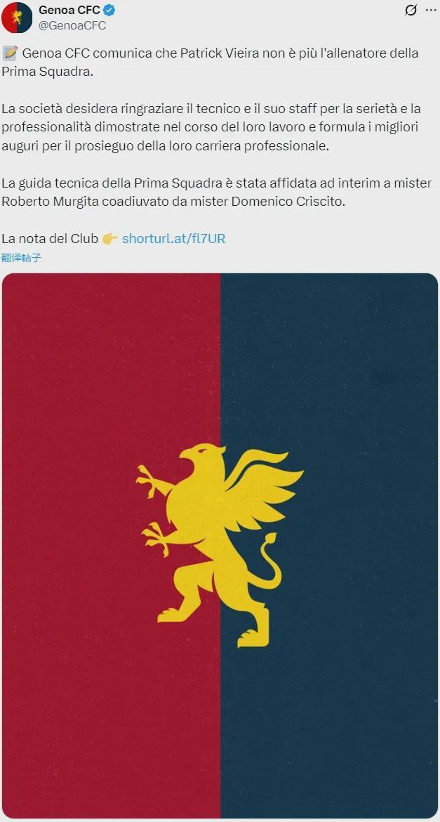 官方:熱那亞宣布解雇了主帥維埃拉。