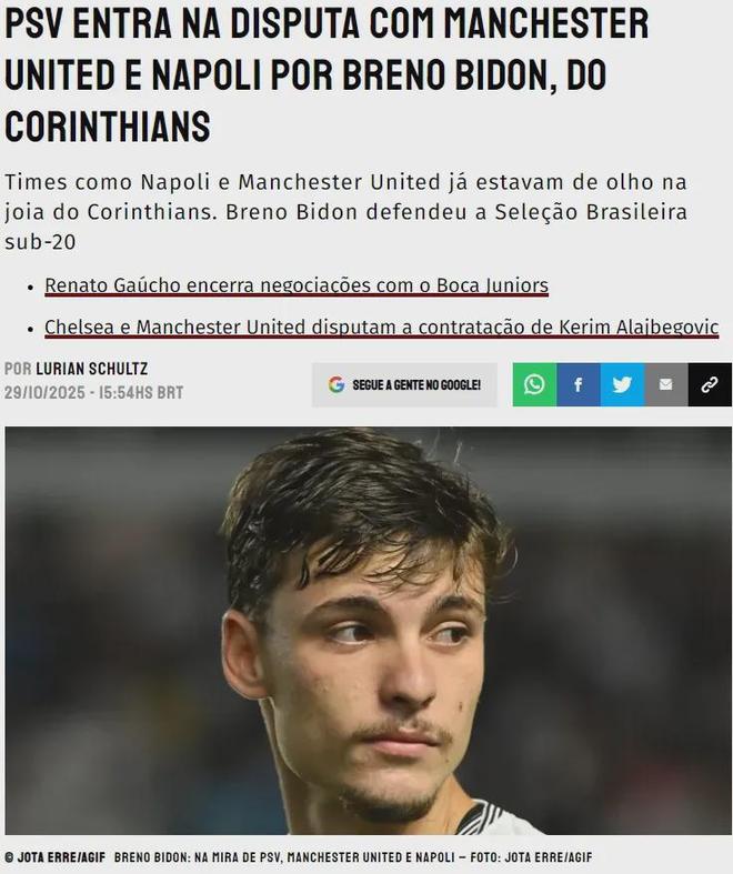 Somos Fanaticos消息,曼聯(lián)有意收購巴西中場布雷諾-比頓(Breno Bidon),這名20歲的新星還吸引了埃因霍溫和那不勒斯的興趣。